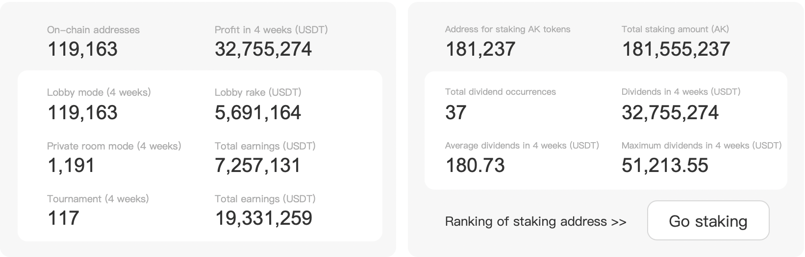 The previous sections have emphasized the AK Team's mission for all poker enthusiasts to become platform shareholders and engage in governance. By staking AK Tokens and becoming a platform shareholder, individuals will be eligible for weekly dividends.