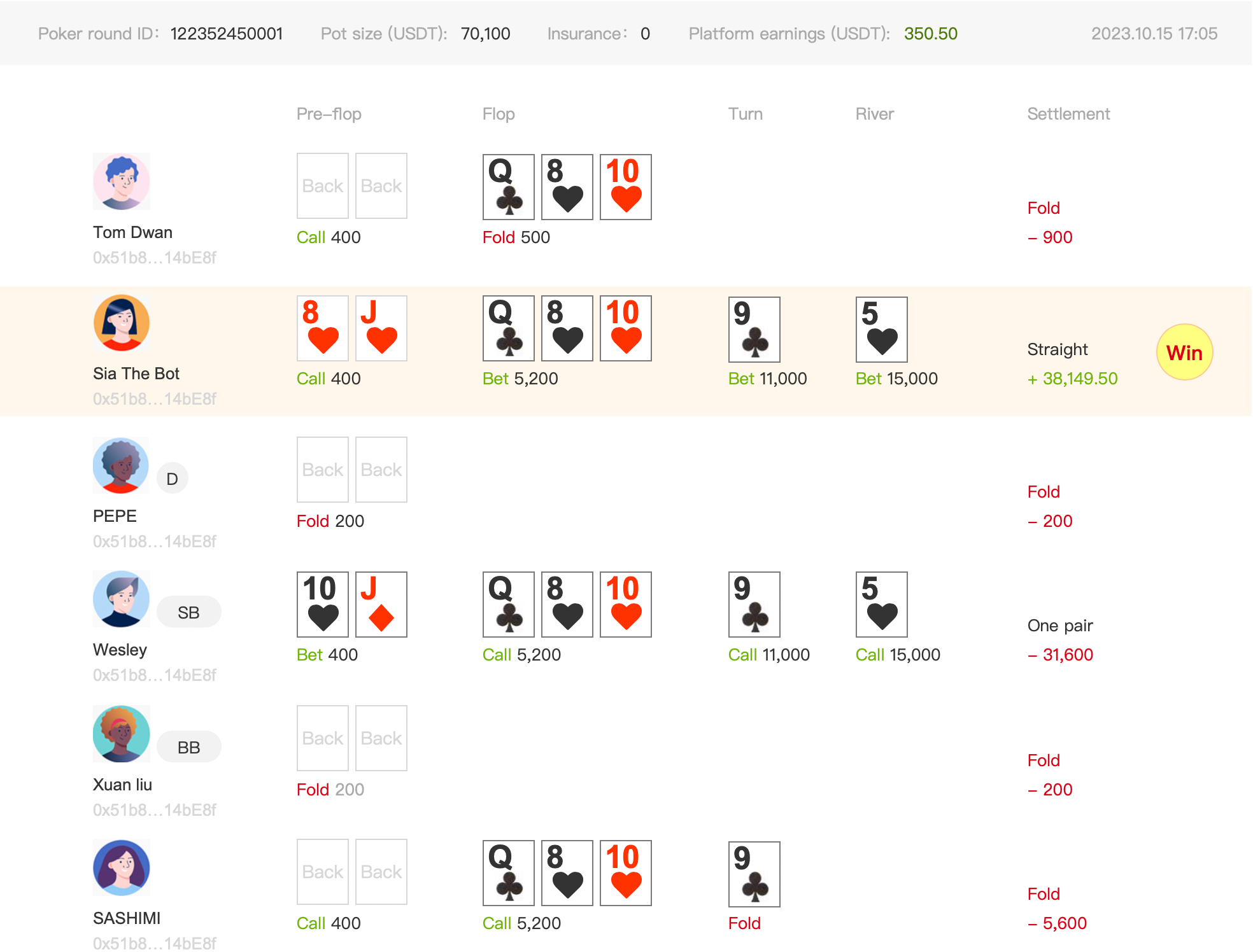Each hand is assigned a unique ID, accompanied by comprehensive game data. Following the conclusion of each hand, we hash the entire game result data onto the blockchain. Beneath the data for each hand, we present the game data and offer a hash generation tool to help users check and verify on the blockchain.