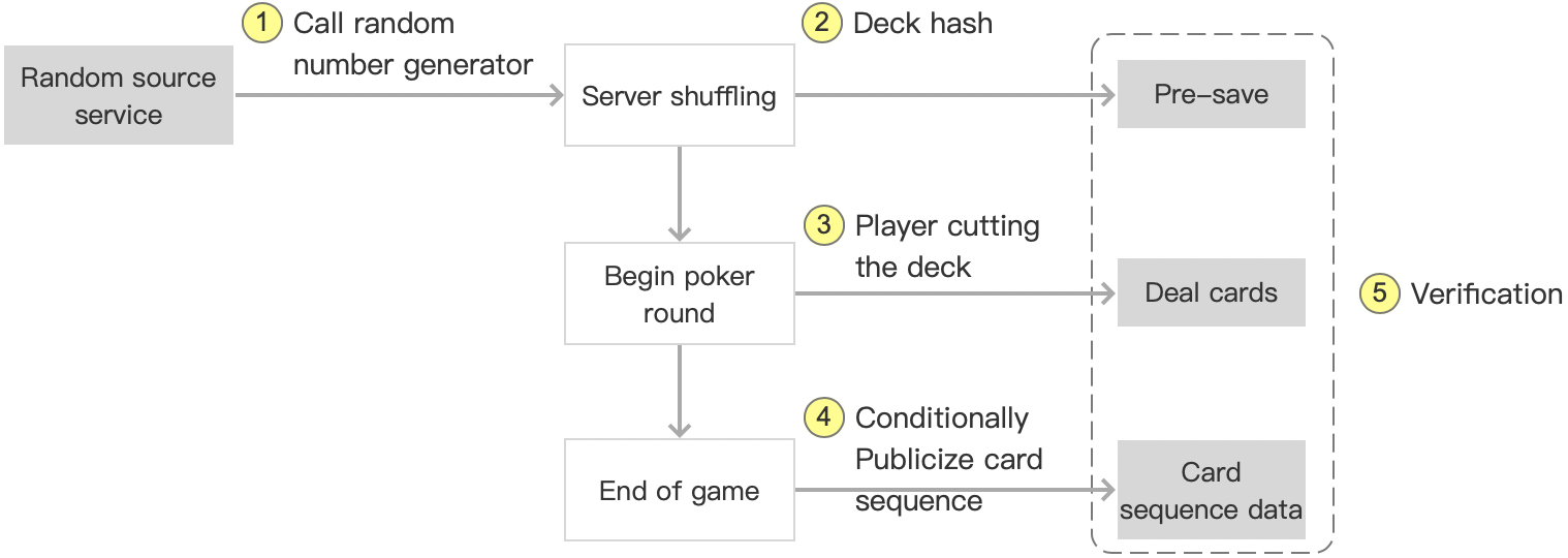 Step 1: Invoke a third-party random generator to shuffle the cards before dealing.